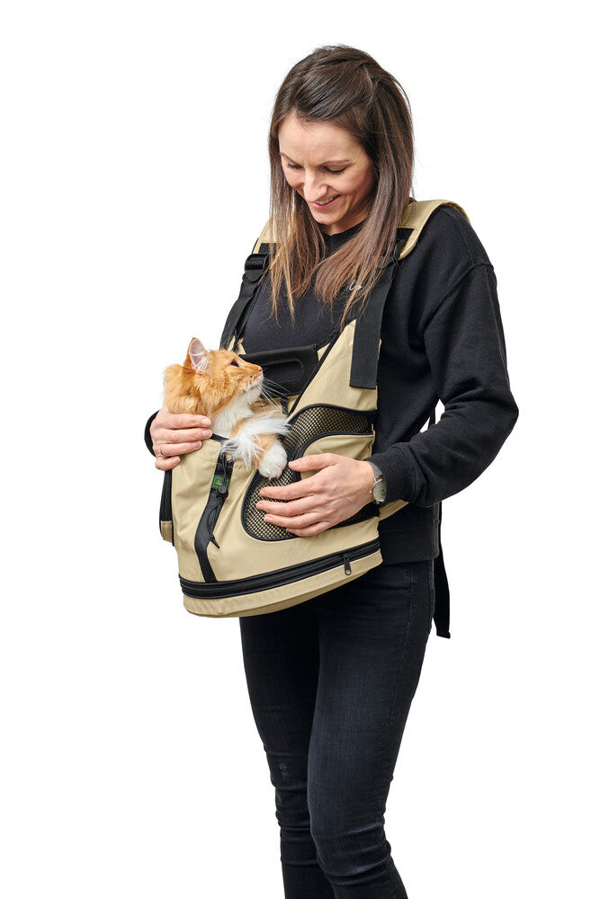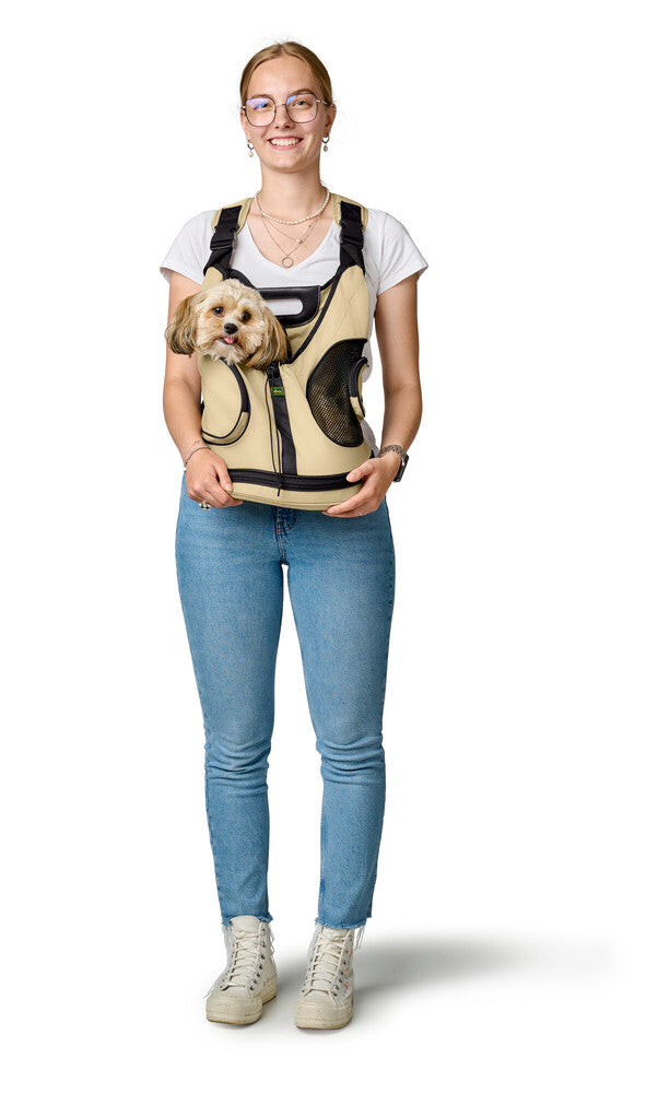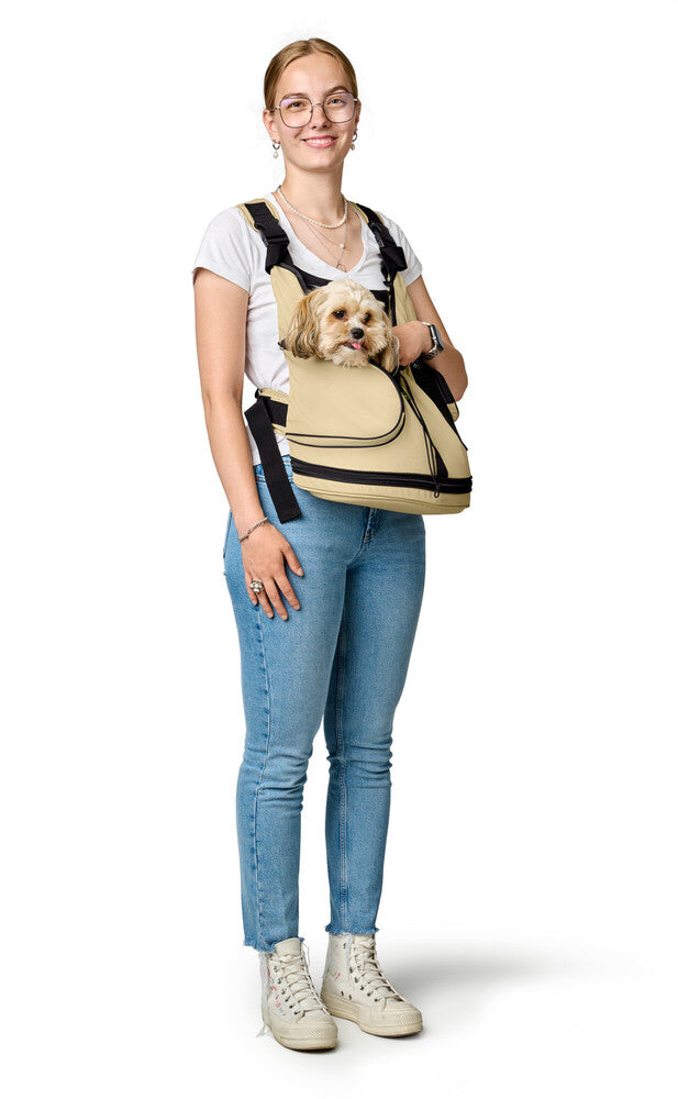 Táto klokanka je športová a praktická alternatíva prenosných tašiek. Môžete dávať pozor na svojho malého miláčika za všetkých okolností, ale zároveň budete mať voľné ruky. Praktický vak je vyrobený z materiálu, ktorý je možné prať pri teplote 30 °C. Má mäkkú vložku ako výplň, kde Váš psík bude sedieť, nylonový pás a malú karabínu na pripevnenie Vášho psíka na obojok. Vnútornú výšku vreca je možné prispôsobiť zipsom na spodnej strane. Taška je tiež pohodlná pre majiteľa psa vďaka jeho nastaviteľným a polstrovaným ramenným popruhom. Brušný pás, ktorý je upevnený za chrbtom, slúži ako dodatočná podpora. Taška je vhodná pre šteniatka a malé psy.